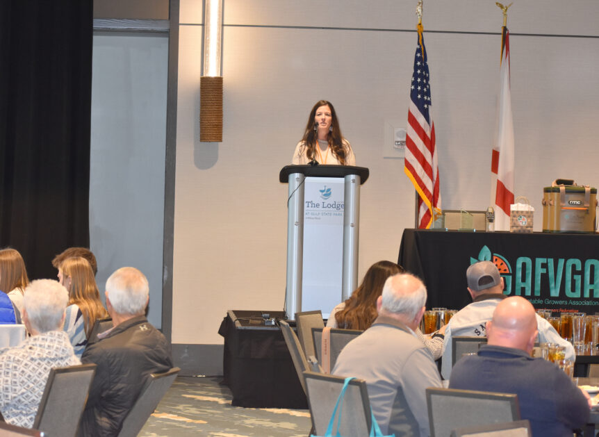 AFVGA President Taylor Hatchett talked about her own farming operation’s experience when speaking at the conference. She said if growers have their crops sold beforehand, that alleviates a lot of stress once harvest time begins.